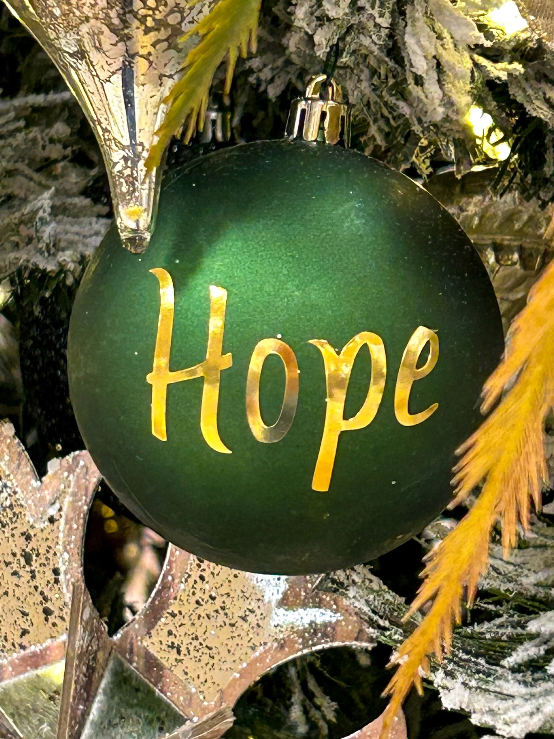 A “Hope” ornament on a Christmas tree decorated by Kevin