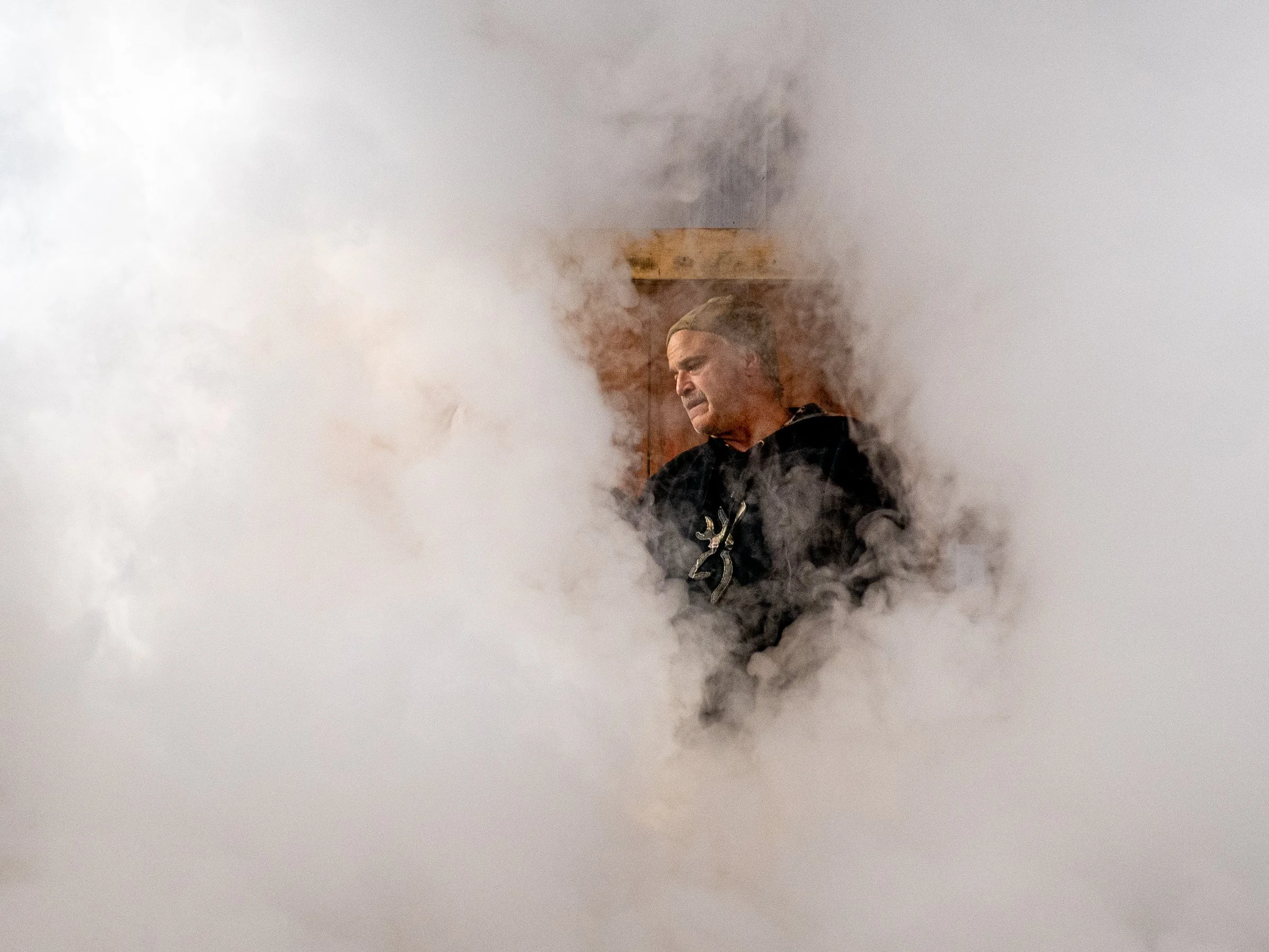 Kelly O’Dell, owner of O’Dell’s Tug Hill Maple in Copenhagen, stands behind a cloud of smoke in the sugar shack at Champion Peak Maple on Saturday morning. Zachary Canaperi/Watertown Daily Times
