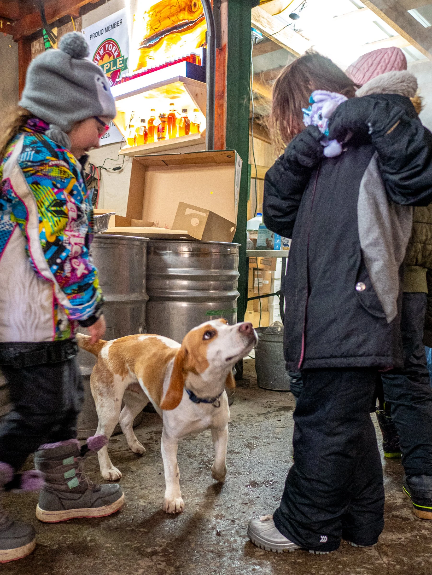 Children play with a beagle at Champion Maple in Copenhagen on Saturday morning during a Maple Weekend tour. Zachary Canaperi/Watertown Daily Times