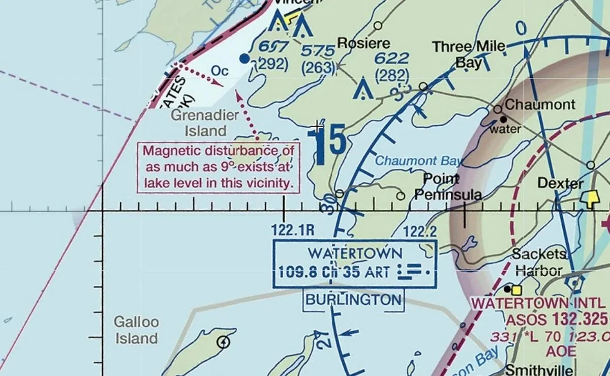 An aeronautical chart warning of a 9-degree magnetic disturbance by Charity Shoal in Lake Ontario. Watertown Daily Times